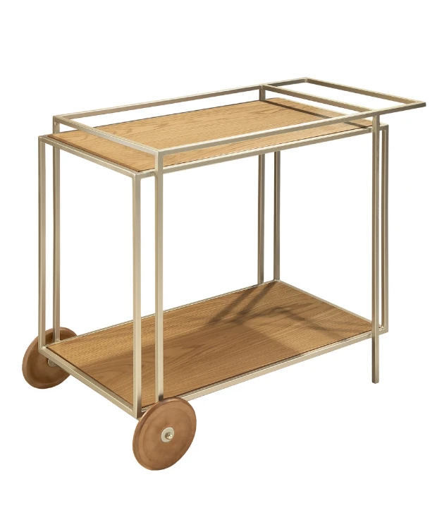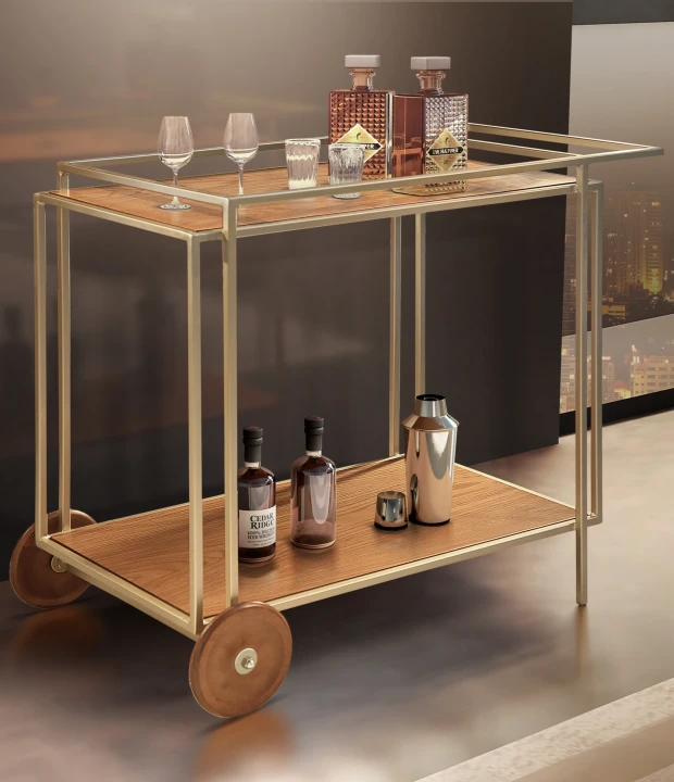O bar Amsterdam possui estrutura metálica, tampos de MDF revestido com lâmina natural de madeira ou com acabamento laqueado e rodas em madeira maciça.