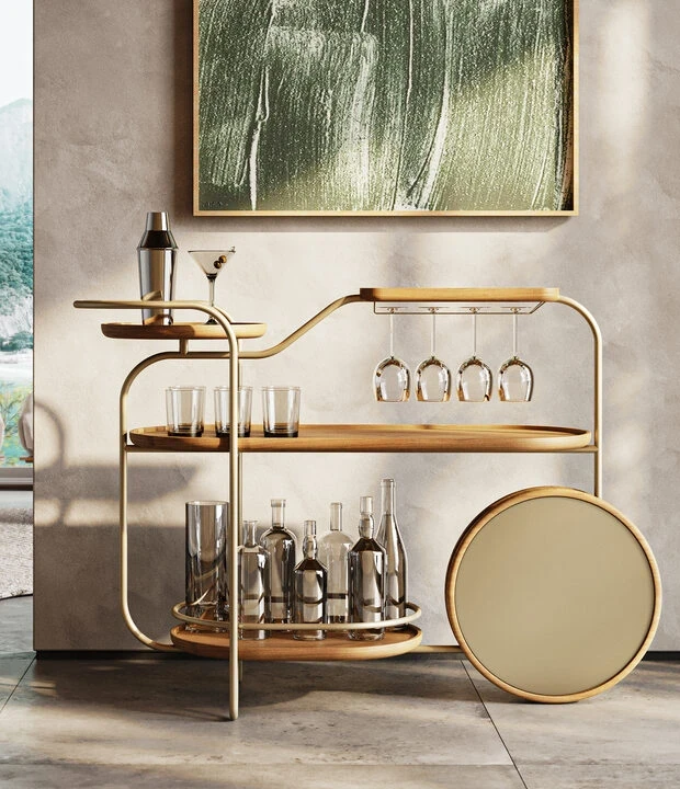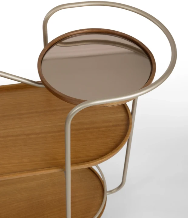 O carrinho bar Dintorno é um móvel compacto e prático, sua base é produzida em metal e suas prateleiras em madeira maciça ou laqueada, há também um espelho bronze em sua prateleira superior. Com um design orgânico de linhas fluidas, destaca-se em ambientes estreitos como salas de jantar, salas de estar e escritórios. O nome "Dintorno" sugere contornos, refletindo-se no design que inclui prateleiras espaçosas, suporte invertido para taças e apoios superiores.