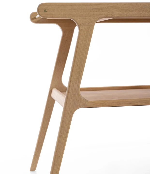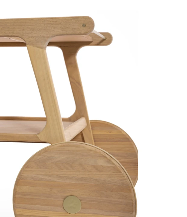 Aspecto fluido, curvas suaves e forte protagonismo da madeira maciça são as principais características do carrinho de chá Torii. Inspirado na cultura japonesa e, como o nome já sugere, teve sua forma baseada nos portais presentes em santuários. Possui tampos em MDF revestido com lâmina natural de madeira e hastes em aço carbono, que contrastam com a madeira e auxiliam no manuseio da peça, buscando ser o essencial: um apoio para servir no dia a dia.