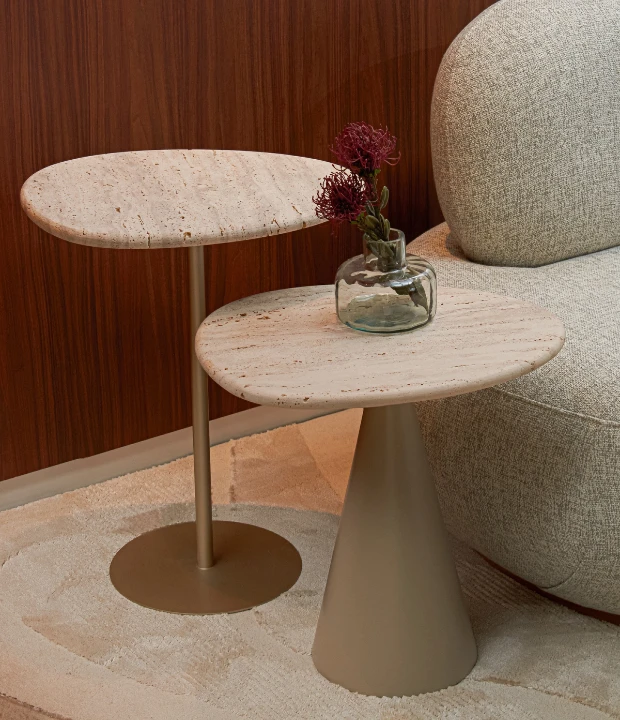 Com um design que evoca a delicadeza de uma pétala de flor, o conjunto de mesas Pétala exibe um tampo versátil. Disponível em opções de madeira, laca ou pedra. Sua base é confeccionada em metal, proporcionando uma combinação elegante e funcional.