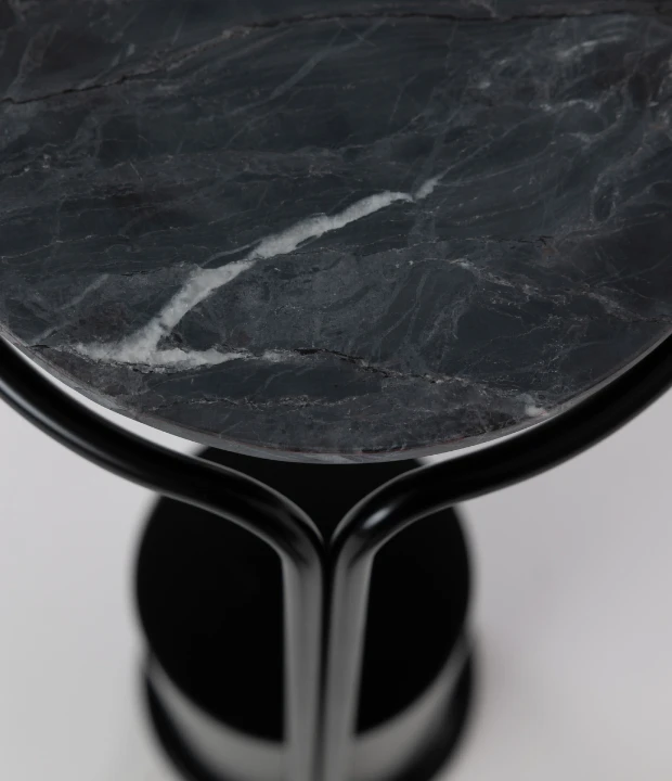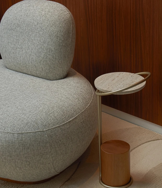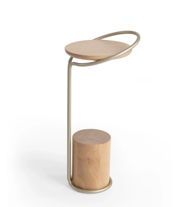 A mesa de apoio Inerê é uma escultura funcional inspirada na inerência que confere singularidade. Seu design, com um tampo desafiador e uma estrutura sinuosa, transforma a mesa em uma peça encantadora. Com uma base maciça e cilíndrica de madeira ou laca, possui também uma estrutura metálica orgânica. A mesa combina elegância escultórica com funcionalidade. Leve e versátil, oferece opções variadas de acabamento no tampo, podendo ser de madeira maciça, laca ou pedra.