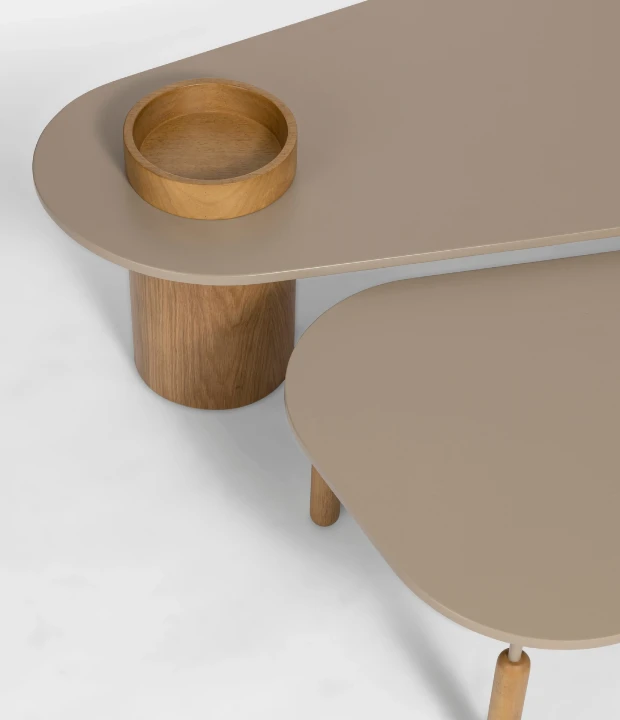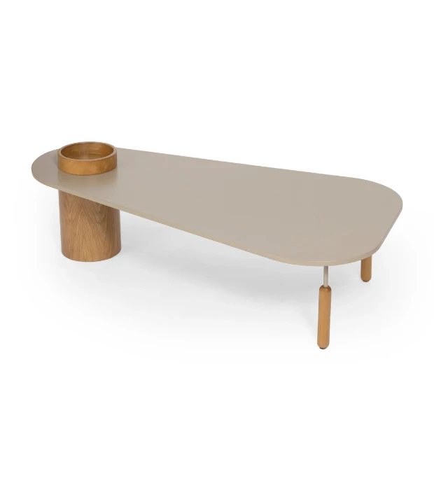 A mesa de centro Ceci possui tampo de MDF laqueado ou revestido em lâmina natural de madeira, pés de madeira com detalhe em aço e, na versão maior, uma base laminada com um mini cachepô em seu tampo.