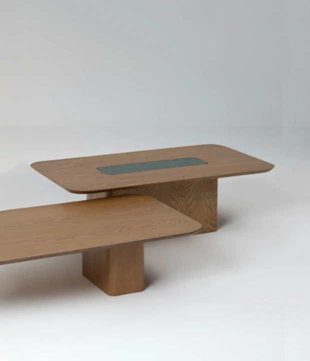 A mesa de centro Flauta é produzida em MDF laqueado ou revestido em lâmina natural de madeira, com detalhe no tampo, disponível em pedra, madeira ou MDF laqueado.