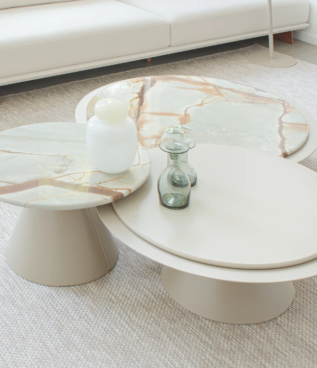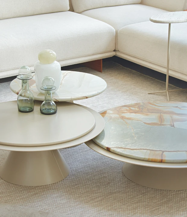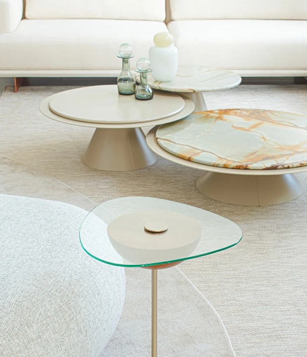 A mesa de centro Solar é composta por duas mesas de tamanhos diferentes. A mesa (A) possui tampo duplo, superior e inferior. O tampo superior possui opção em pedra, MDF com acabamentos em laca ou lâmina; o tampo inferior pode ser feito laminado ou laqueado. A mesa (B), de tampo único, pode ser feita em pedra, MDF laminado ou laqueado. A base de ambos os tamanhos são confeccionadas em lâmina natural de madeira ou laca, com um detalhe metálico laqueado.