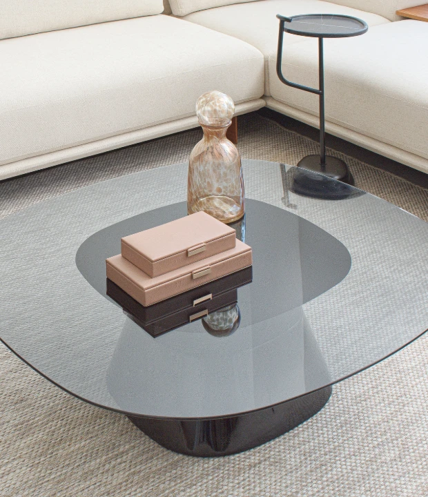 A mesa de centro Valsa é uma harmônica composição com três tamanhos diferentes. Inspirada na graça e fluidez da valsa, as mesas (A) e (B) possuem tampo com vidro translúcido ou fumê, com pintura no centro, além de haste metálica e base com acabamento laqueado. A mesa (C) é produzida em MDF laqueado ou laminado.
