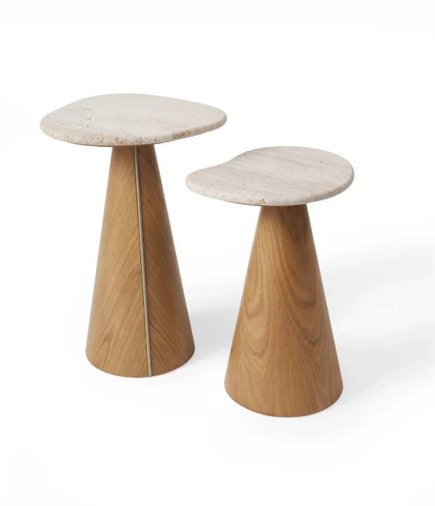 A mesa lateral Colina é feita em MDF com acabamento em laca ou revestido com lâmina natural de madeira e detalhe de aço carbono em sua base. Está disponível em três tamanhos com diferentes formatos de tampo. O tampo pode ser feito em pedra, MDF laqueado ou revestido com lâmina natural de madeira.