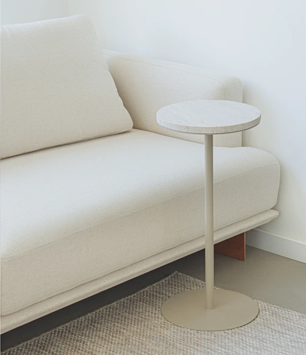 A mesa lateral Cristal possui estrutura metálica e tampo em pedra natural. Há quatro opções de pedras: travertino, onix, branco acetinado e preto escovado.