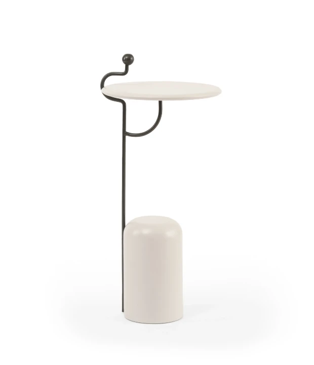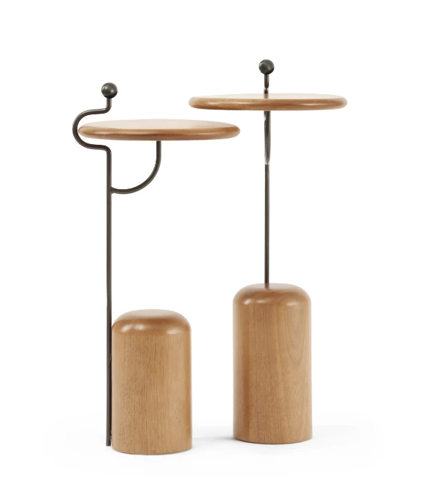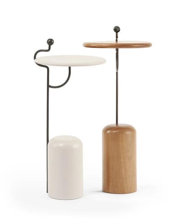 A mesa lateral Órbita possui tampo e base em madeira maciça ou em MDF laqueado. Sua estrutura é feita em aço carbono com ponteira em madeira laqueada.