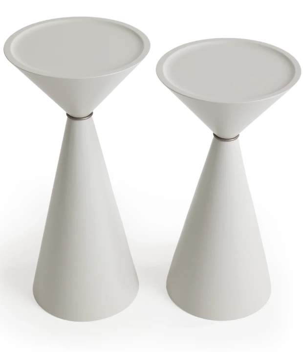 Com um design cônico marcante, a mesa lateral Tule é fabricada em madeira maciça ou MDF laqueado, evidenciando uma refinada argola em metal que delimita o tampo da base. Cada detalhe do design foi minuciosamente pensado para estabelecer uma divisão harmoniosa, resultando em elementos refletidos que acentuam a estética singular da peça.